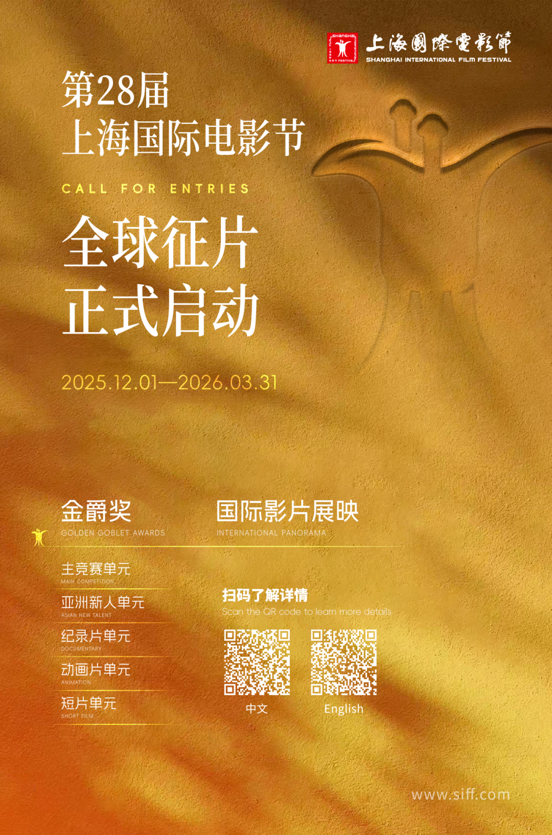 新的一年,上海国际电影节将整装待发,从红海继续向“蓝海”挺进。12月1日,第28届上海国际电影节已正式启动面向全球征片,范围包含金爵奖主竞赛、亚洲新人、纪录片、动画片、短片五个竞赛单元,及国际影片展映单元,欢迎世界影人共赴光影之约。