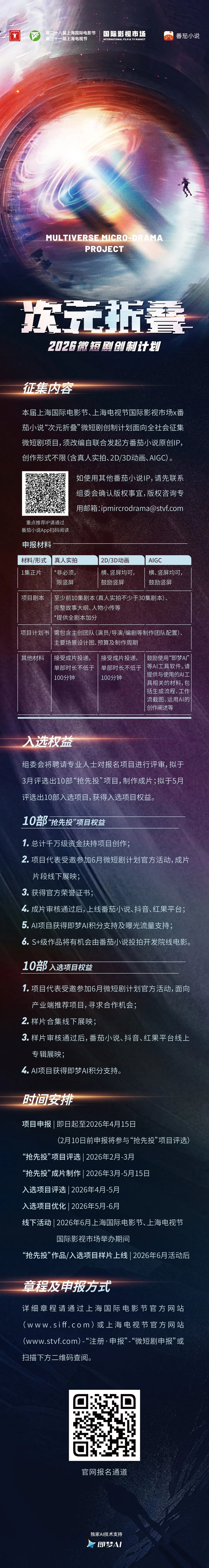 12月26日,上海国际电影节、上海电视节国际影视市场,携手番茄小说,正式向全社会创作者发出邀请:加入“次元折叠”微短剧创制计划,下一部爆款,由你开启。