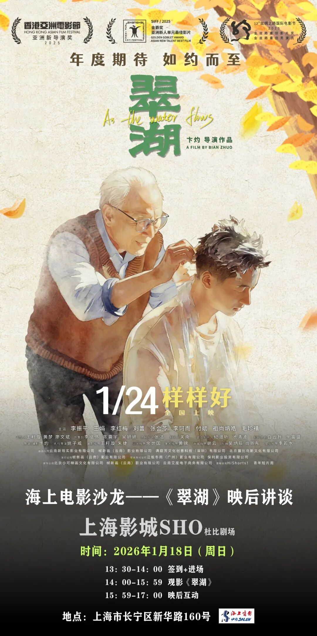 在全国公映前的1月18日下午,《翠湖》将在上海影城SHO可容纳千人的杜比剧场厅举办首映礼。映后交流环节,主创将在现场随机抽取10位到场的幸运观众,送出上海国际电影节的精美衍生品各一套。