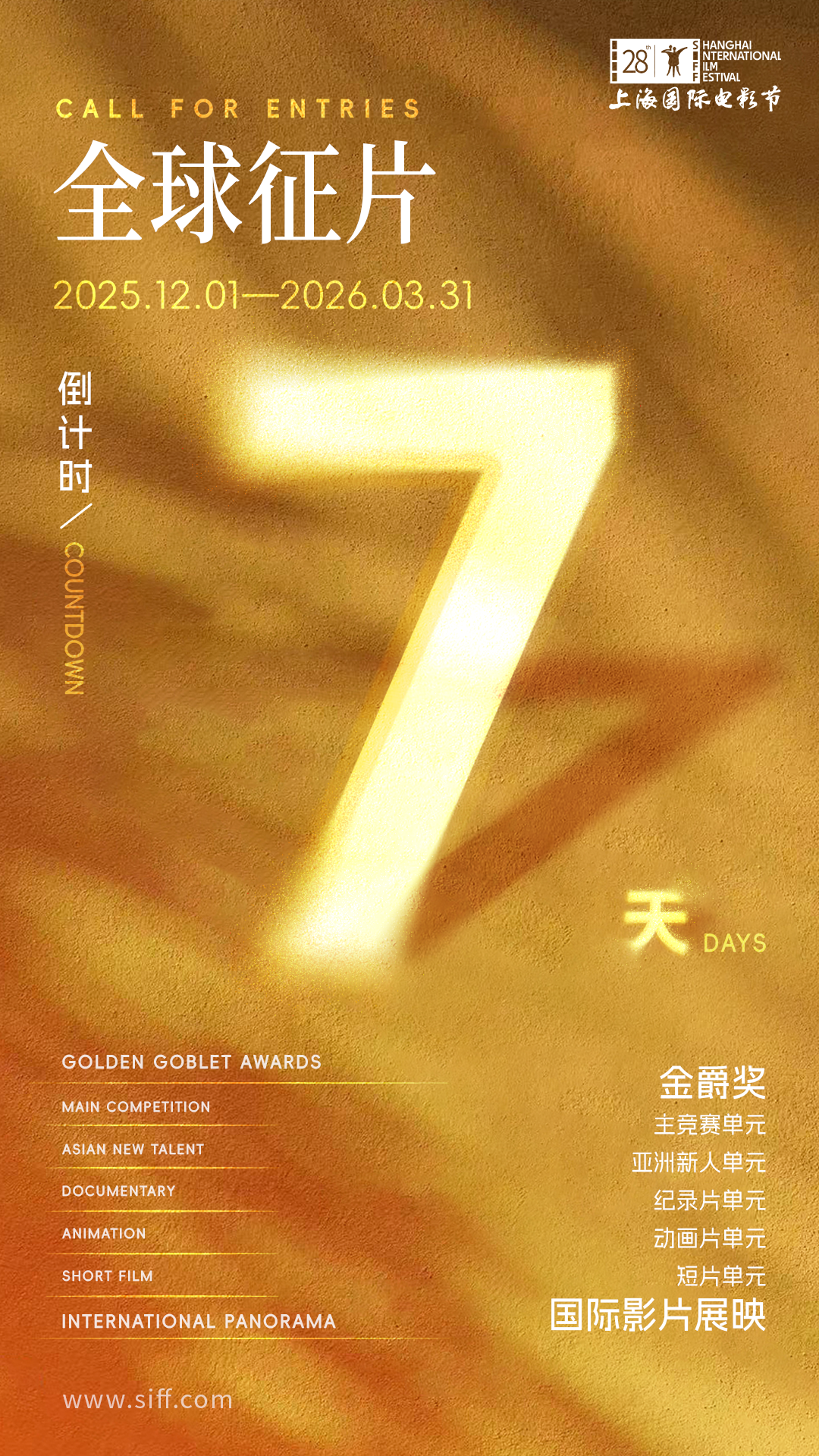第28届上海国际电影节征片仍在持续征集中,金爵奖评选及国际影片展映的征片截止时间为3月31日,有意向参赛、参展的世界影人和制作团队,请把握住这仅剩的7天时间,尽快申报。今年6月,让我们相聚上海这座电影之城,共享电影之梦!
