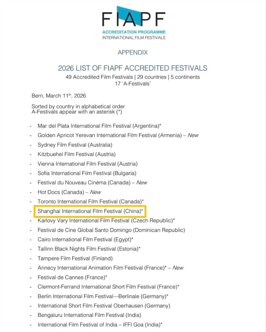 国际电影制片人协会(FIAPF)近日公布全新“A类电影节”名单,上海国际电影节凭借近两年的综合表现、优异数据和越来越突出的国际影响力成功入选,世界A类的含金量更加凸显。